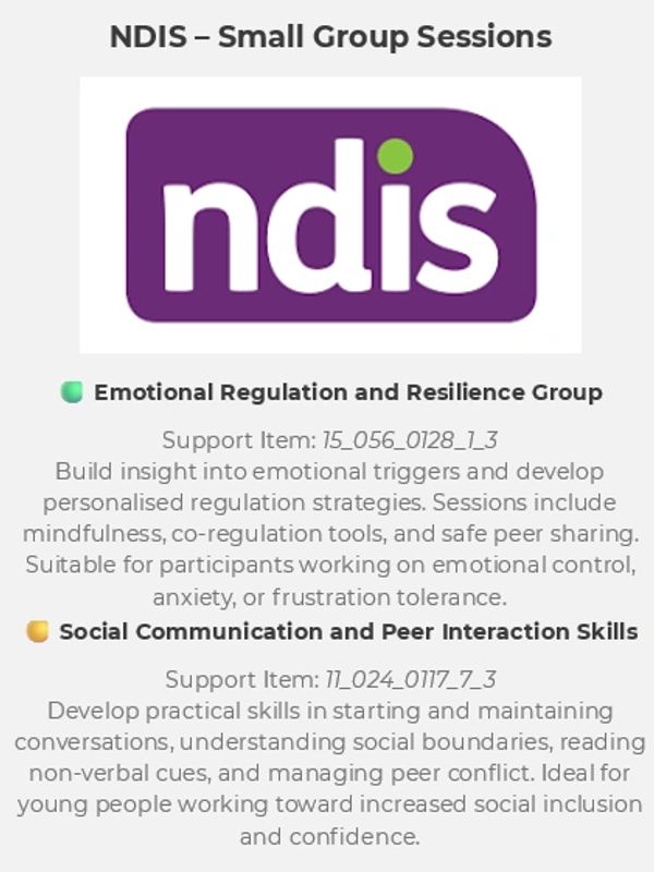 My services include individual counselling and small group sessions targeting specific NDIS goals such as emotional regulation, daily living skills, communication, and employment readiness. I collaborate with participants and families to ensure each person feels heard, supported, and empowered to reach their goals in meaningful, practical ways.